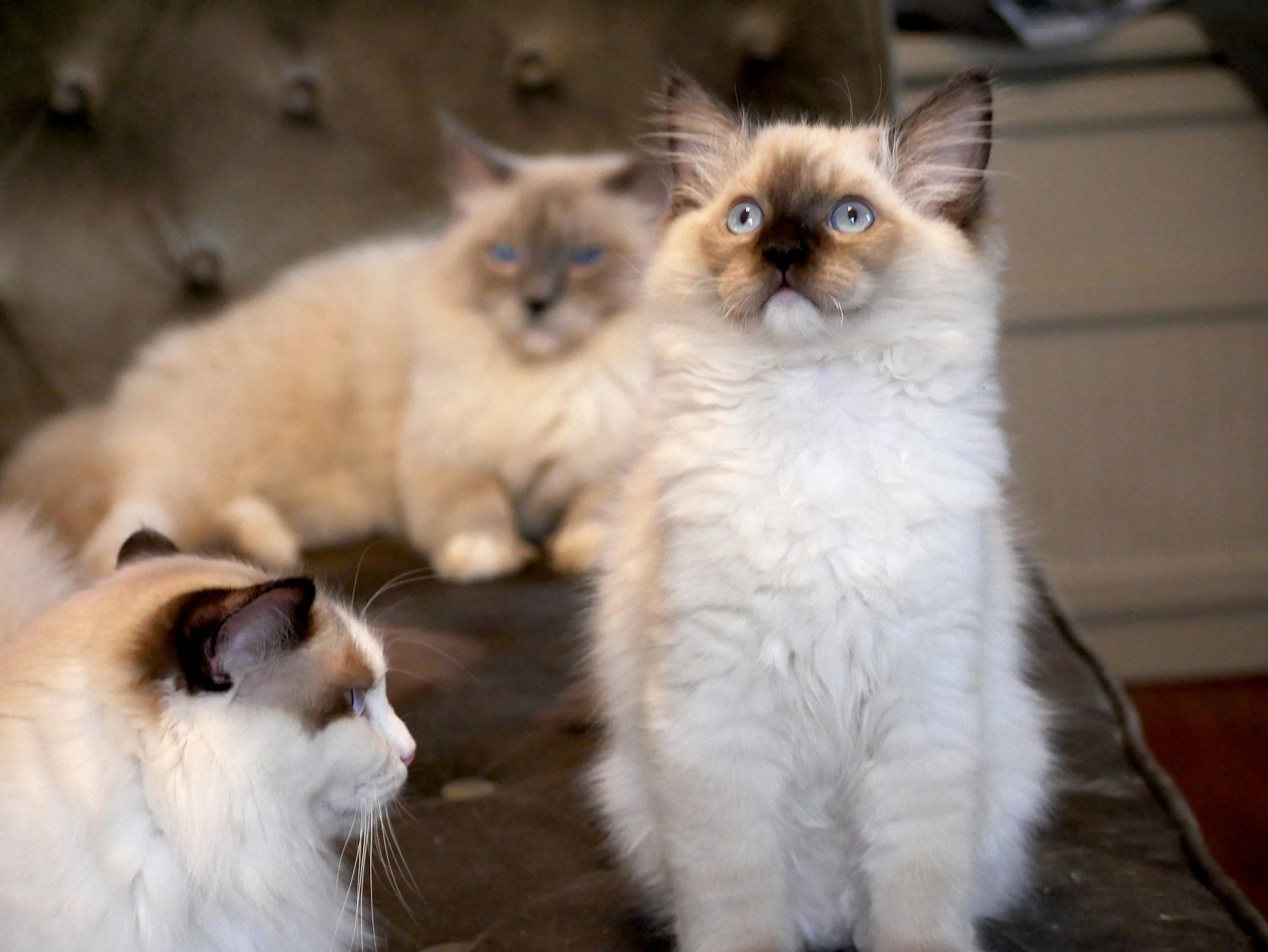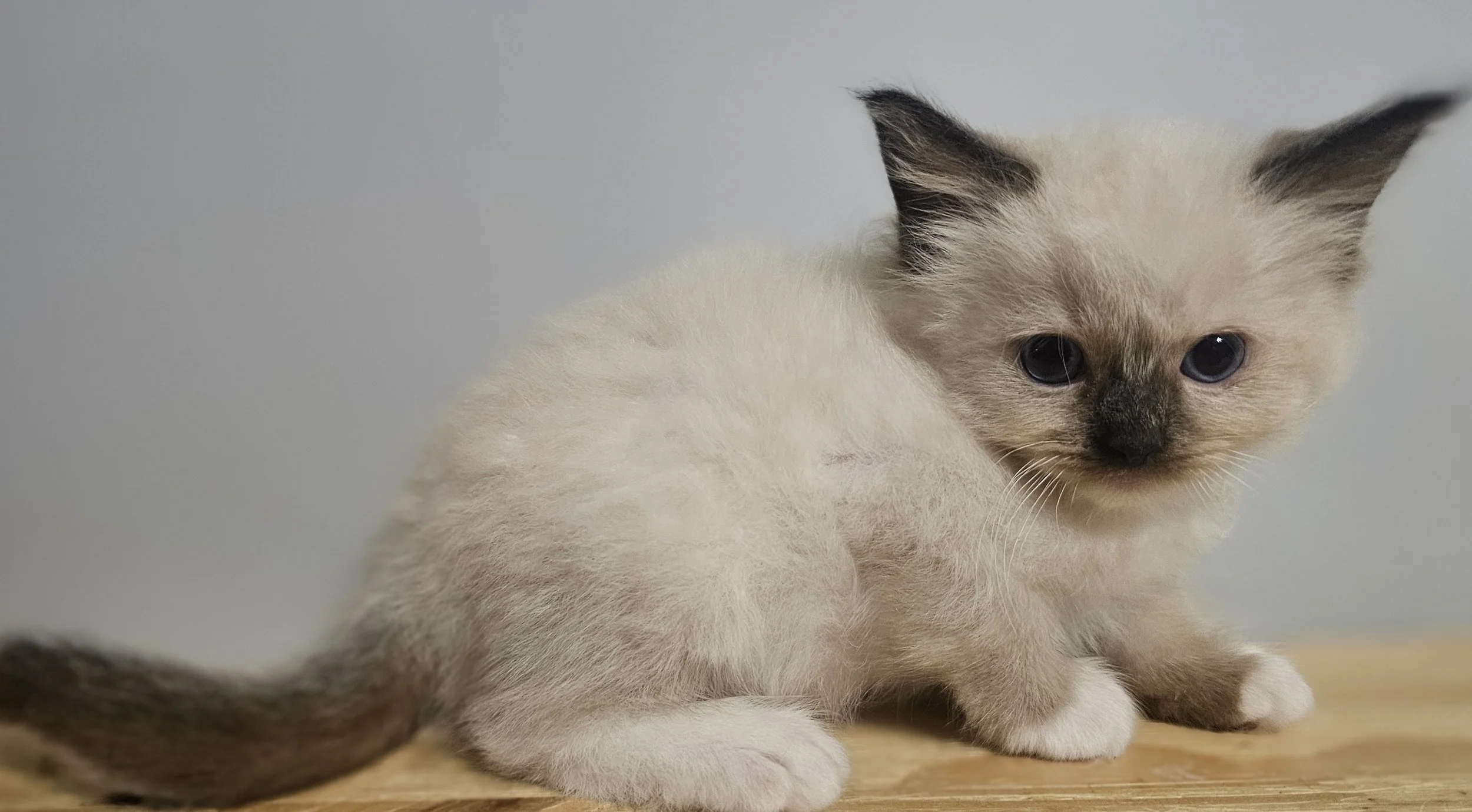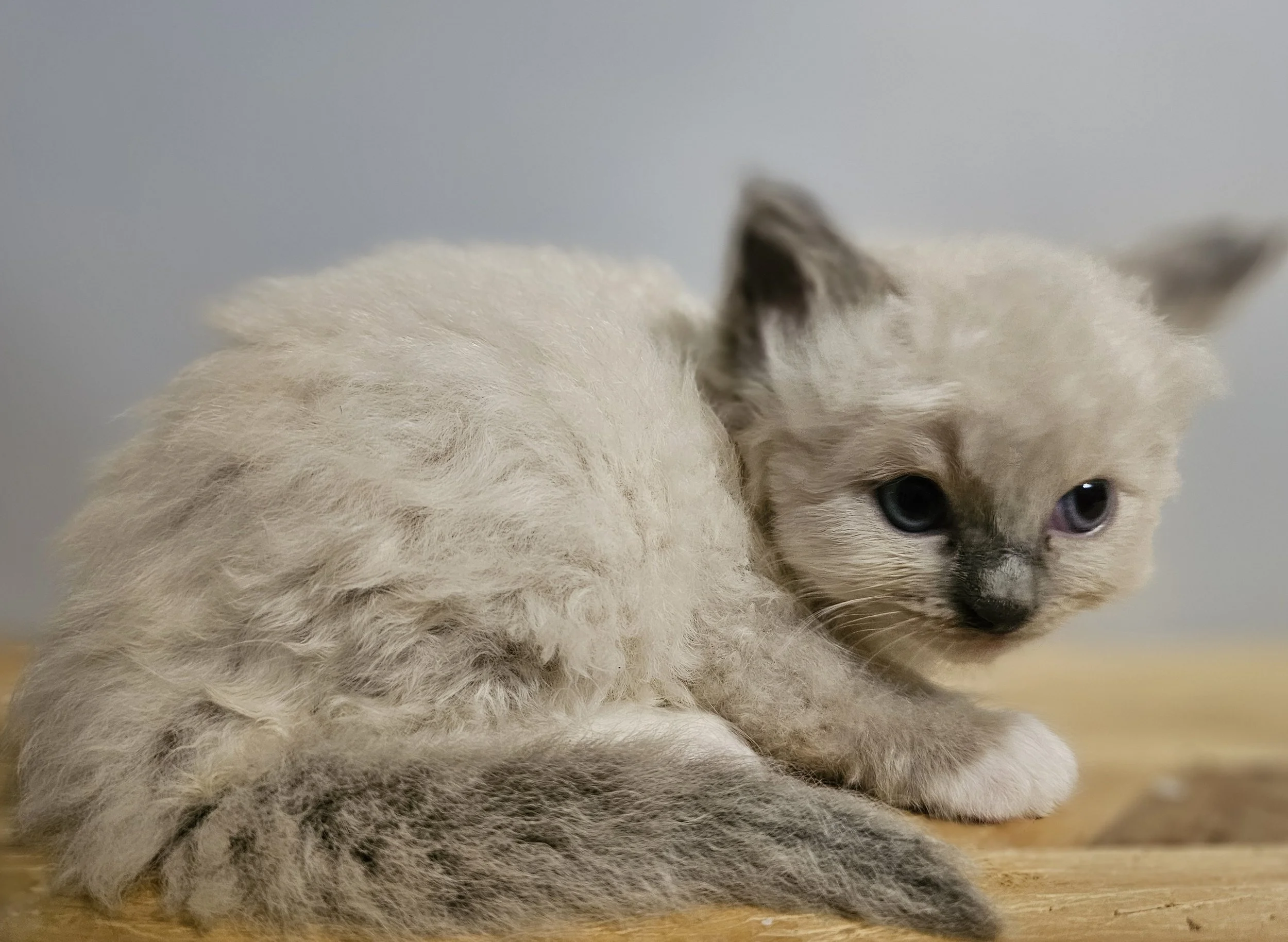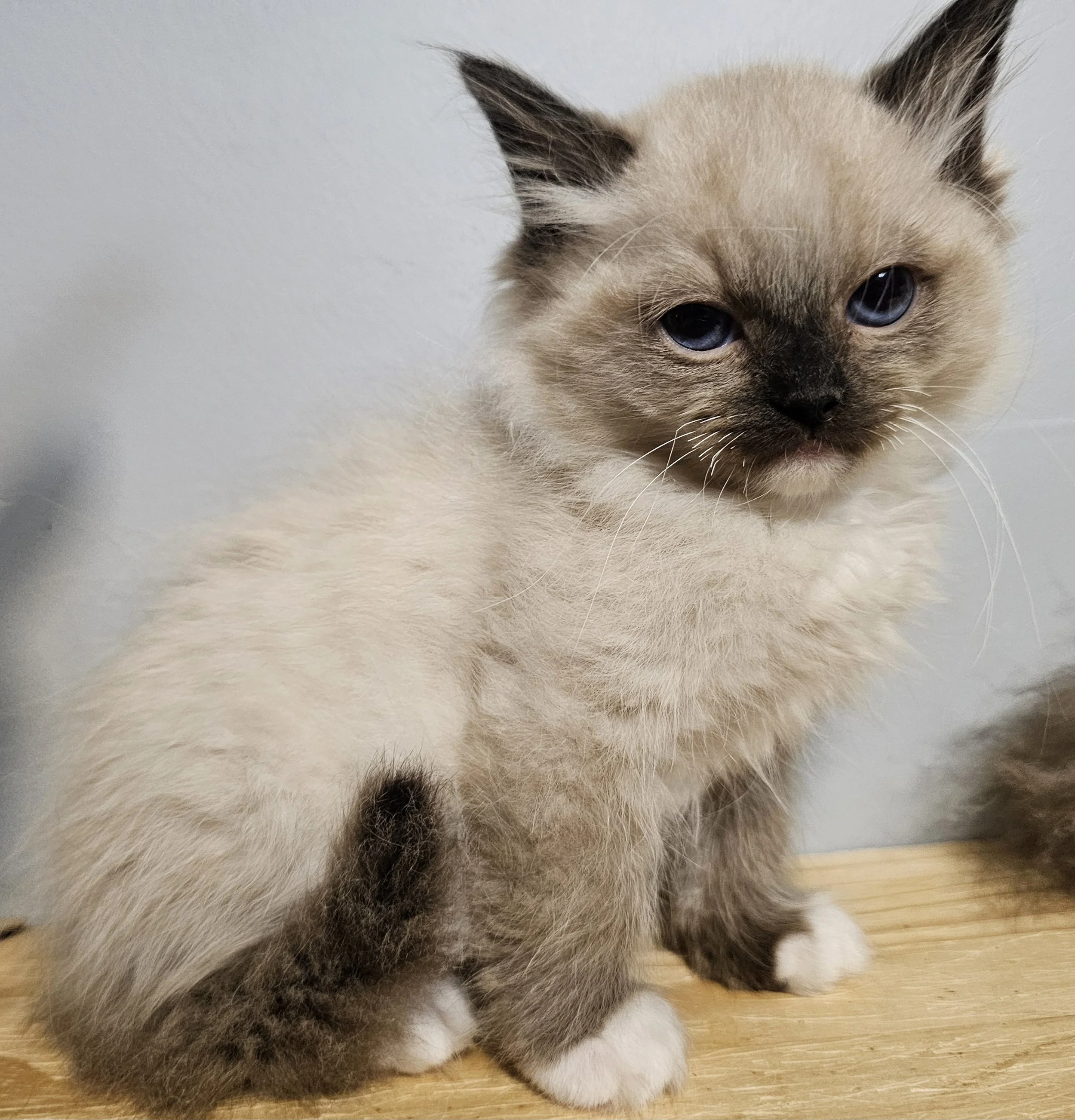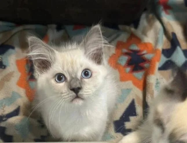 Kittens colors are seal and blue. Patterns are bicolor, pointed, and mitted. See the adults section for labeled examples of each color and pattern.